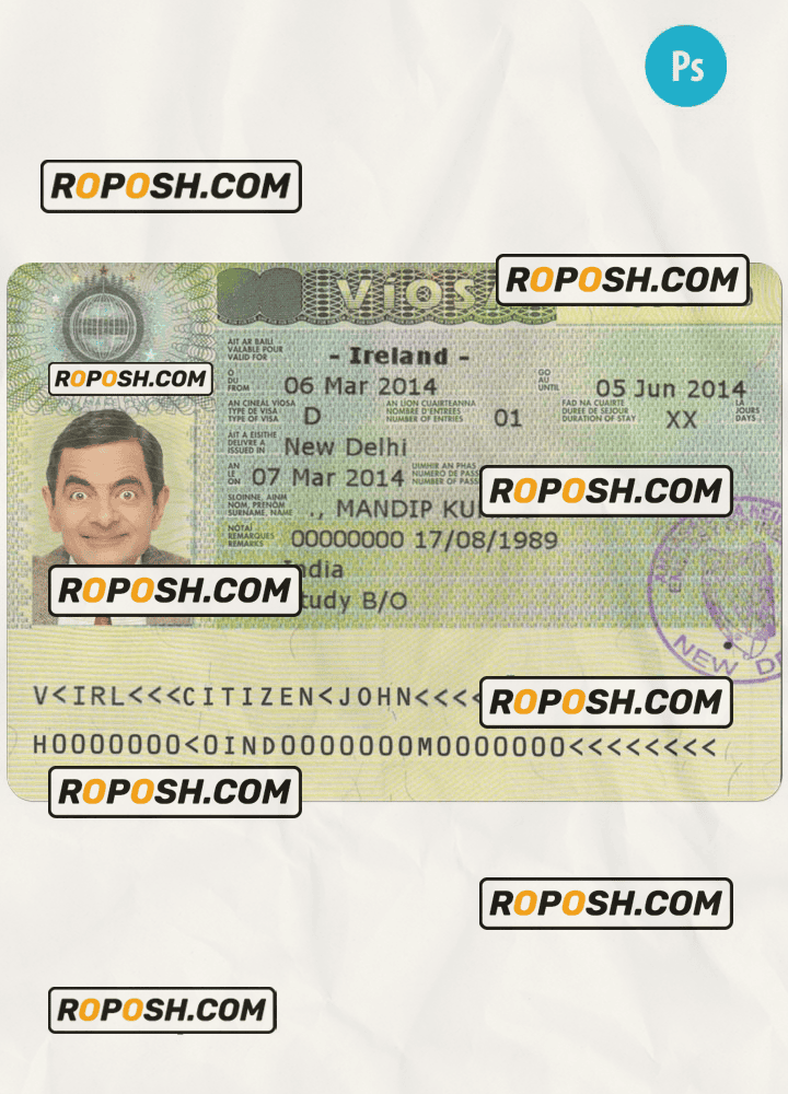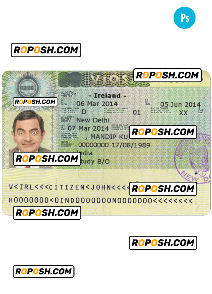 IRELAND travel visa template psd. Buy Customizable Travel Visa Template with high quality and enjoy its unique features such as easy to customize, Layer based, fonts included sample. you can edit this template and put any name, address, license number, Id number, birth date, height, weight, expire date, change photos etc. This Photoshop template is a layer based psd file and it’s easy to Editing.To modify this photoshop template file you will need a Photo editing software such as Adobe Photoshop No need to be expert on editing software like adobe Photoshop. However, You just have to basic knowledge on adobe photoshop, to edit this template. Never used low quality template. Your account may be suspended. Also, if you’re looking for an editable SSN template, Roposh is by your side so you can get it easily and even for free.