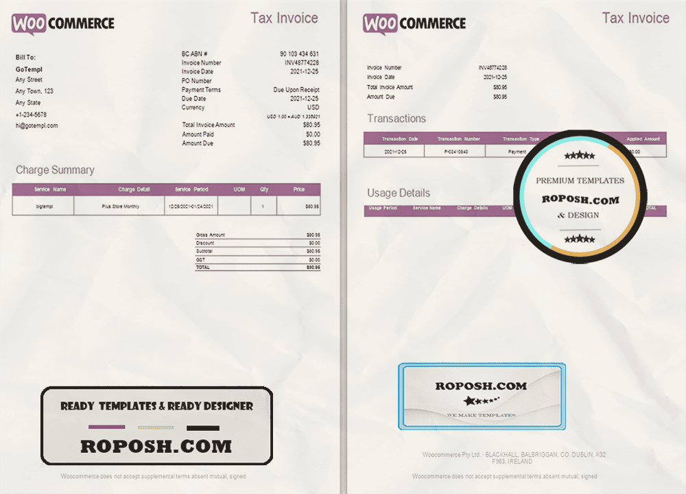 Featuring a wide range of templates from all over the world, the Ireland WooCommerce tax invoice Word Template is fully customizable, and included fonts. Edit all relevant details, such as name, photo, signature, barcodes, and holograms, to create a realistic, high-quality editable invoice template.