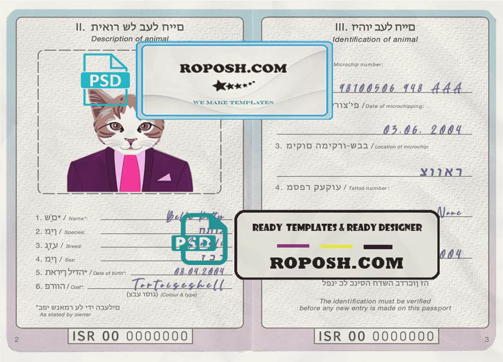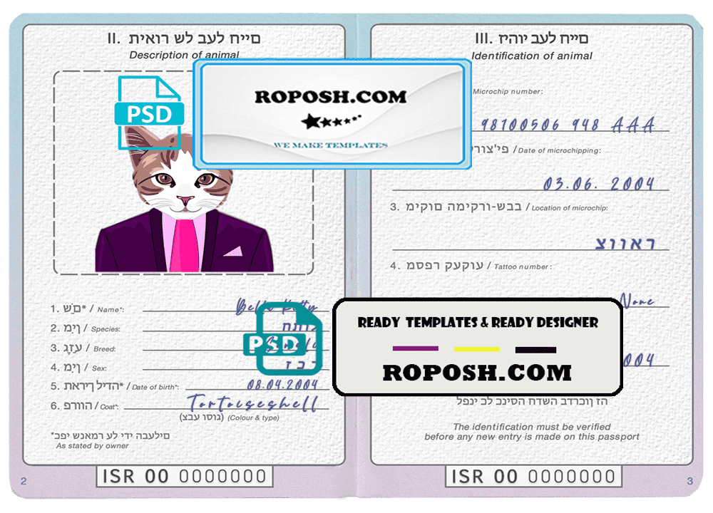 Israel cat (animal, pet) passport PSD template, completely editable