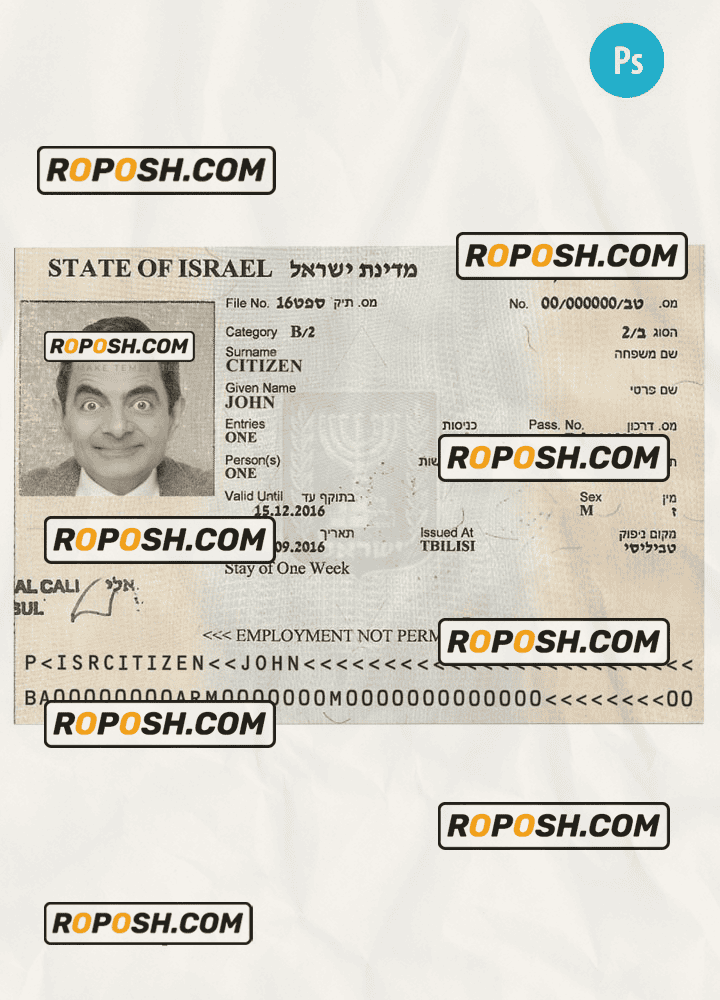 ISRAEL tourist visa template psd. Buy Customizable Travel Visa Template with high quality and enjoy its unique features such as easy to customize, Layer based, fonts included sample. you can edit this template and put any name, address, license number, Id number, birth date, height, weight, expire date, change photos etc. This Photoshop template is a layer based psd file and it’s easy to Editing.To modify this photoshop template file you will need a Photo editing software such as Adobe Photoshop No need to be expert on editing software like adobe Photoshop. However, You just have to basic knowledge on adobe photoshop, to edit this template. Never used low quality template. Your account may be suspended. Also, if you’re looking for an editable SSN template, Roposh is by your side so you can get it easily and even for free.