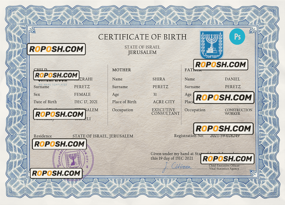 roposh offers hundreds of high-quality, realistic, and customizable birth certificates. The Israel birth certificate template is fully fillable, and you can complete it with any information you wish, such as name, surname, birth date, place of birth and etc. Whether you are using our PSD template (a layer-based adobe photoshop file) or our PDF template (a Microsoft Office editable file) you will get a package with fonts included instantly. No need to worry even if you can’t generate realistic birth proof yourself, we offer reliable editing service with your desired information for an extra charge. Also, we are always online and here to help you experience a confident purchase. So, reach out!