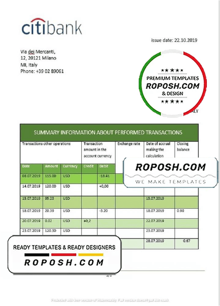 Grab now fully editable Italy Citibank statement Word Template from our website Roposh and put your own info to create Realistic Bank Statement Word template and ready your own novelty documents. It’ll be so beneficial if your Bank Statement is expired, stolen or not available.We also have editable credit card, ID Card psd template, Bank Statement psd template, drivers license psd template & printable editable blank utility bill template.