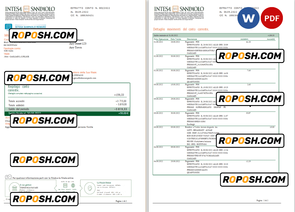 Get your fully editable Italy Intesa Sanpaolo bank statement Word Template from Roposh and personalize it to create your own novelty documents. Ideal for situations where your bank statement is expired, stolen, or unavailable. We also offer editable credit card templates, ID card templates, bank statement PSD templates, driver’s license PSD templates, and printable editable blank utility bill templates.
