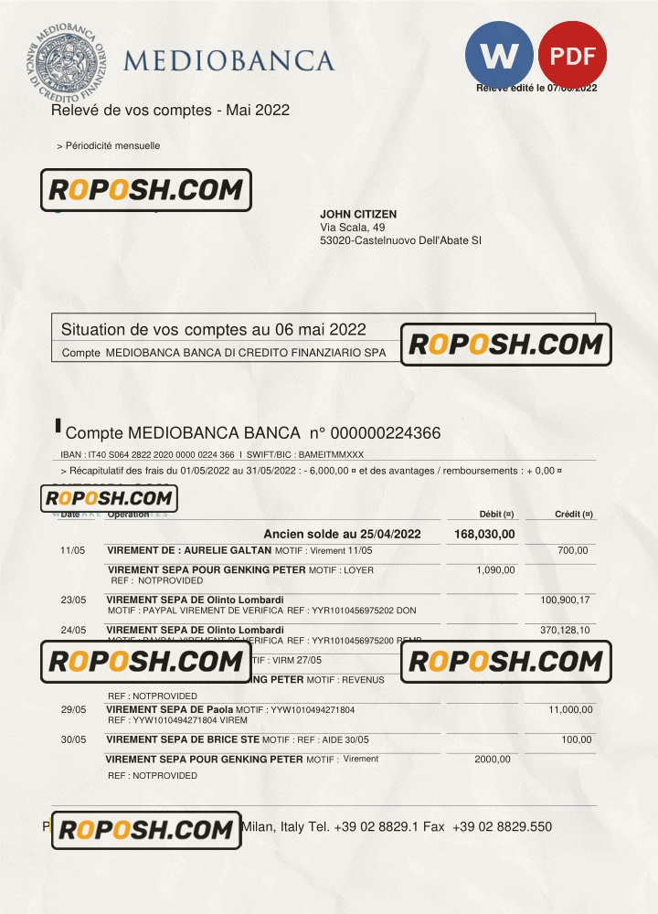 Grab now fully editable Italy Mediobanca bank statement Word Template from our website Roposh and put your own info to create Realistic Bank Statement Word template and ready your own novelty documents. It’ll be so beneficial if your Bank Statement is expired, stolen or not available.We also have editable credit card, ID Card psd template, Bank Statement psd template, drivers license psd template & printable editable blank utility bill template.