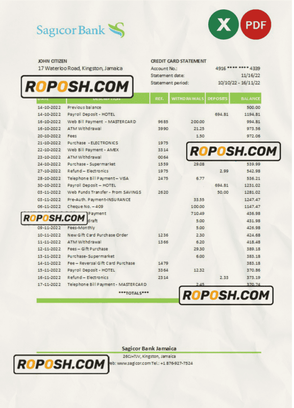 Grab now fully editable Jamaica Sagicor bank statement Excel Template from our website Roposh and put your own info to create Realistic Bank Statement template Excel and ready your own novelty documents. It’ll be so beneficial if your Bank Statement is expired, stolen or not available.We also have editable credit card, ID Card psd template, Bank Statement psd template, drivers license psd template & printable editable blank utility bill template.