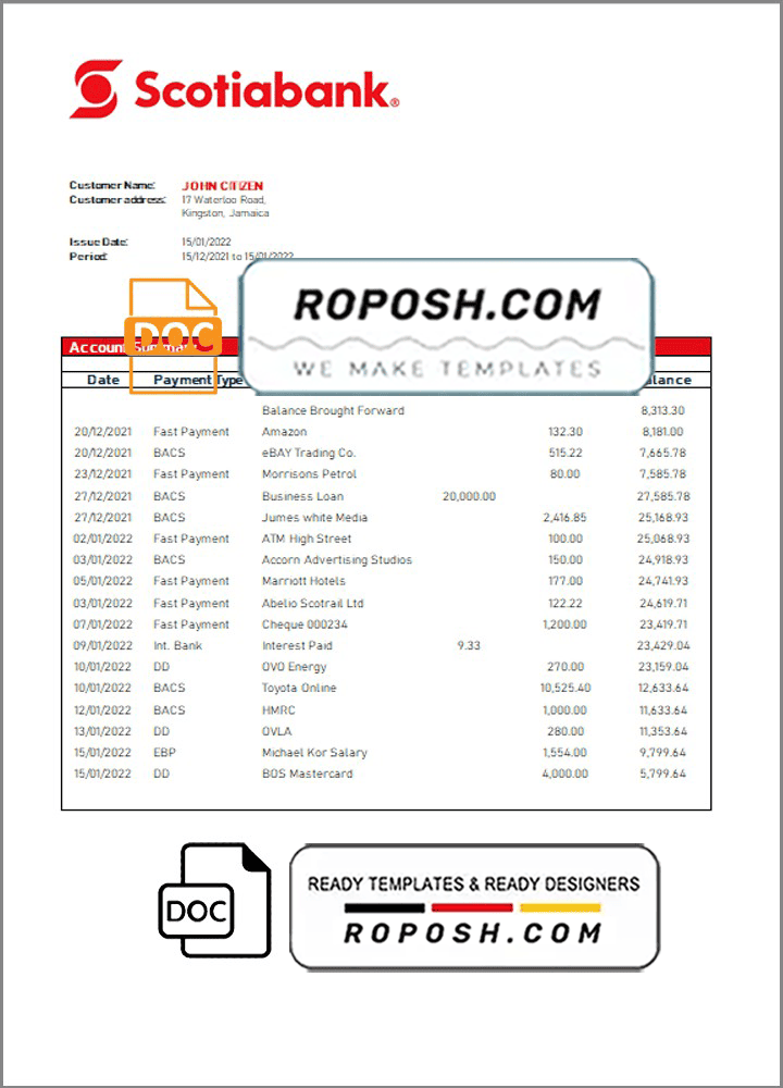 Get your fully editable Jamaica Scotiabank bank statement Word Template from Roposh and create your own novelty documents. This is beneficial if your bank statement is expired, stolen, or unavailable. We also offer editable credit card templates, ID card PSD templates, bank statement PSD templates, driver’s license PSD templates, and printable editable blank utility bill templates.