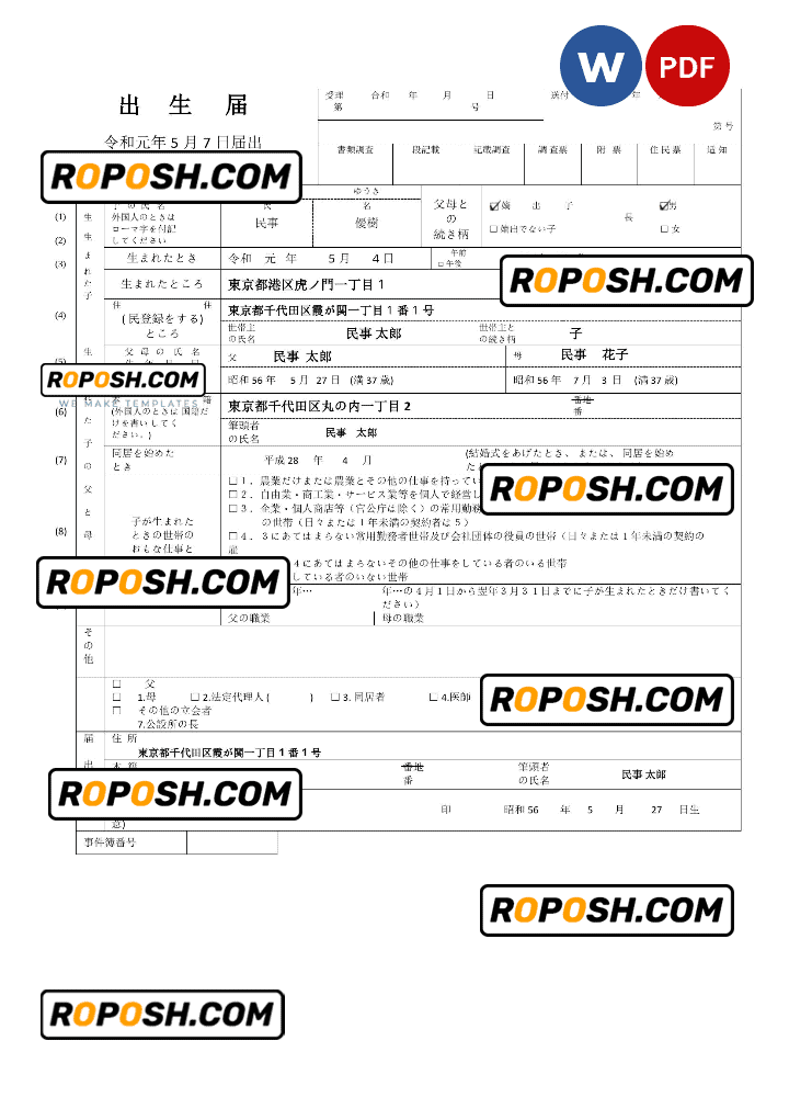 roposh offers hundreds of high-quality, realistic, and customizable birth certificates. The Japan birth certificate template is fully fillable, and you can complete it with any information you wish, such as name, surname, birth date, place of birth and etc. Whether you are using our PSD template (a layer-based adobe photoshop file) or our PDF template (a Microsoft Office editable file) you will get a package with fonts included instantly. No need to worry even if you can’t generate realistic birth proof yourself, we offer reliable editing service with your desired information for an extra charge. Also, we are always online and here to help you experience a confident purchase. So, reach out!