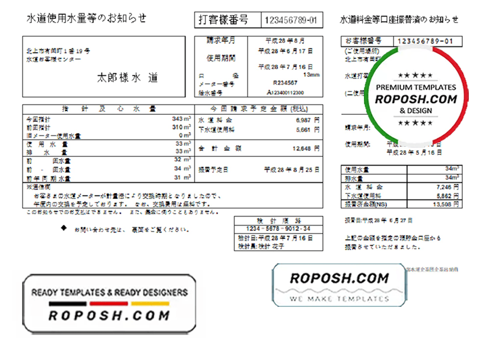 Get your blank Japan Iwate Chubu Waterworks Bureau water utility bill template from Roposh. Customize it with your own information to create a copy for proof of address. Ideal for situations where your utility bill is expired, stolen, or unavailable. Explore our wide range of templates, including passport PSD templates, ID card PSD templates, bank statement PSD templates, driver’s license PSD templates, and utility bill PSD templates.
