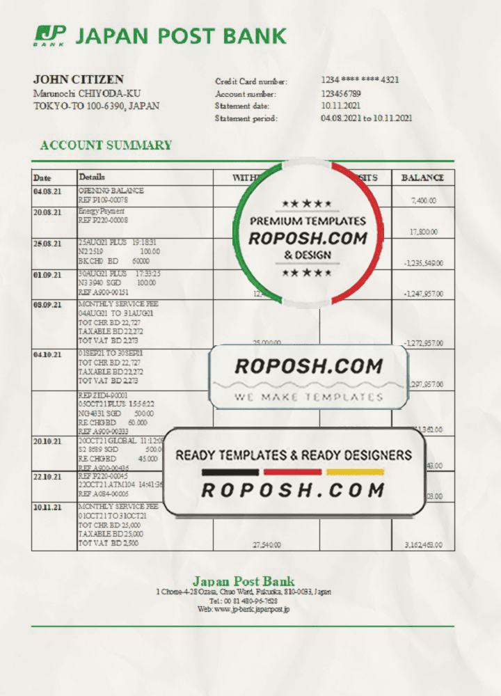 Grab now fully editable Japan Post bank statement easy to fill Excel Template from our website Roposh and put your own info to create Realistic Bank Statement template Excel and ready your own novelty documents. It’ll be so beneficial if your Bank Statement is expired, stolen or not available.We also have editable credit card, ID Card psd template, Bank Statement psd template, drivers license psd template & printable editable blank utility bill template.