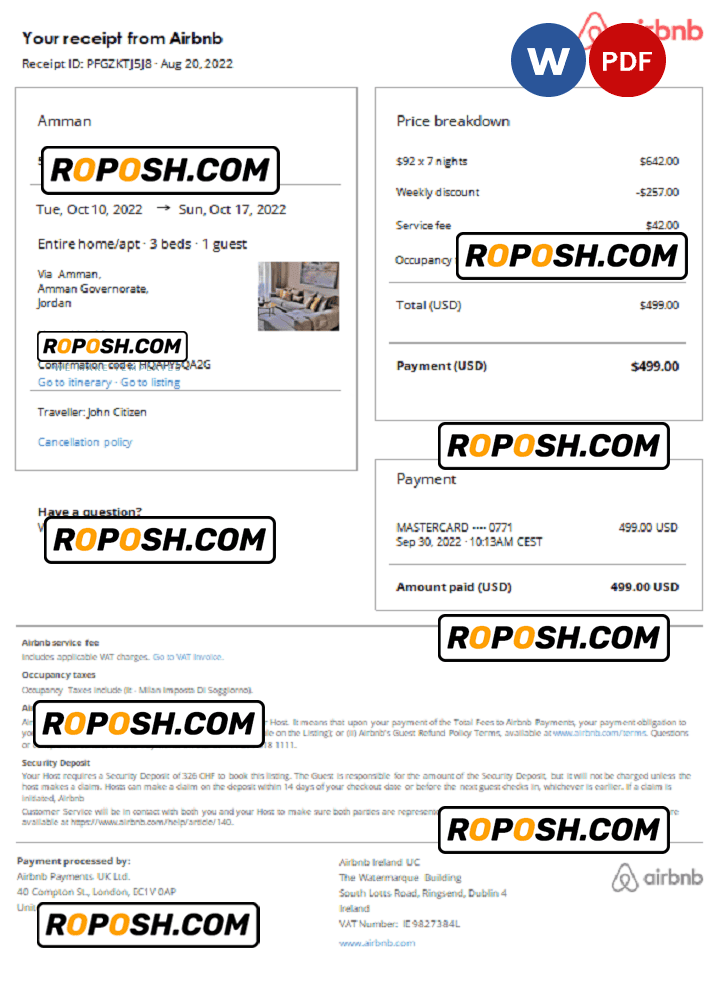 This Blank Jordan Airbnb booking confirmation PDF Template is perfect for a variety of uses, such as Visa applications, proof of accommodation, showing your expenses, and more. You can even use it to create realistic copies of your credit card for novelty documents. We have a variety of other templates available, including passport templates, ID card templates, reciept template, and more.