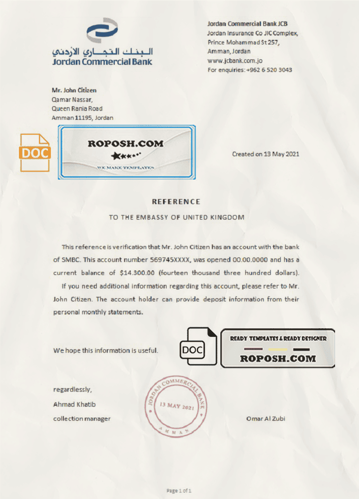 Jordan Commercial bank account reference letter template in Word and PDF format