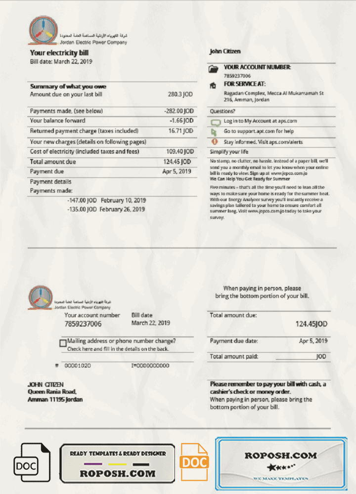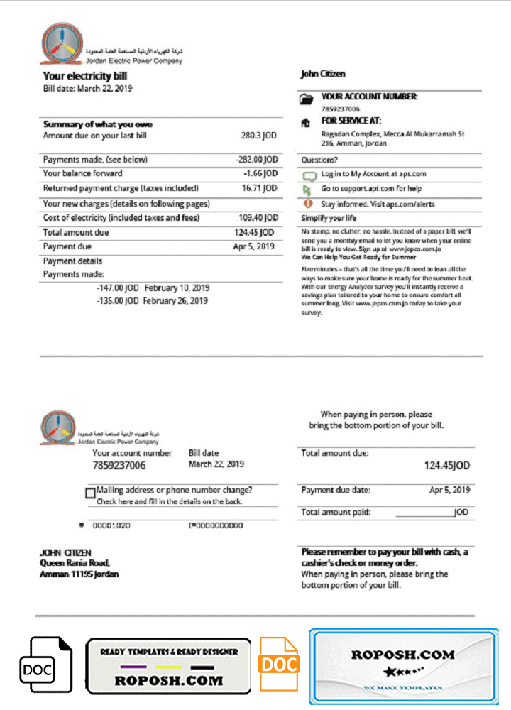 Download our high-quality, fully editable Jordanian Electric Power Co (JEPCO) electricity utility bill template in Word format. This customizable template is perfect for creating a realistic proof of address. Easy to edit with Microsoft Word, it includes all necessary fonts and is layer-based for simple customization. Add any name, address, license number, ID number, birth date, height, weight, expiration date, and more. Ideal for replacing lost or expired utility bills.