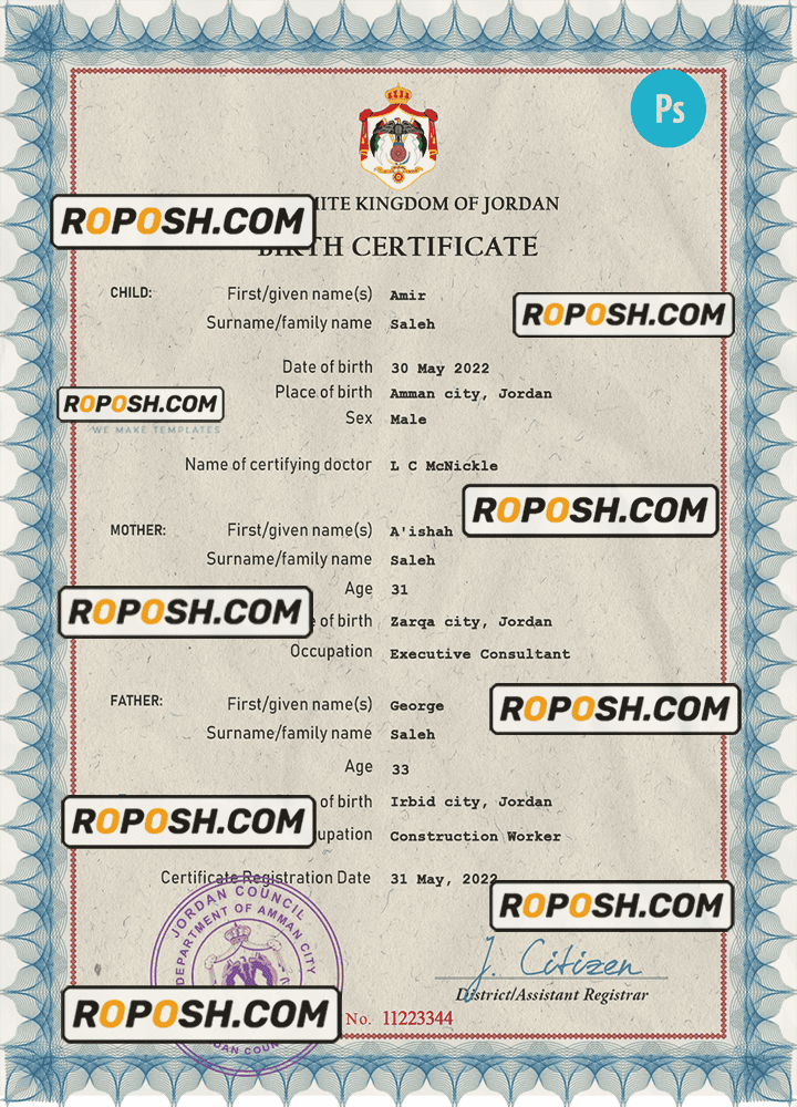 roposh offers hundreds of high-quality, realistic, and customizable birth certificates. The Jordan birth certificate template is fully fillable, and you can complete it with any information you wish, such as name, surname, birth date, place of birth and etc. Whether you are using our PSD template (a layer-based adobe photoshop file) or our PDF template (a Microsoft Office editable file) you will get a package with fonts included instantly. No need to worry even if you can’t generate realistic birth proof yourself, we offer reliable editing service with your desired information for an extra charge. Also, we are always online and here to help you experience a confident purchase. So, reach out!