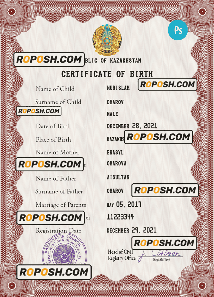 roposh offers hundreds of high-quality, realistic, and customizable birth certificates. The Kazakhstan birth certificate template is fully fillable, and you can complete it with any information you wish, such as name, surname, birth date, place of birth and etc. Whether you are using our PSD template (a layer-based adobe photoshop file) or our PDF template (a Microsoft Office editable file) you will get a package with fonts included instantly. No need to worry even if you can’t generate realistic birth proof yourself, we offer reliable editing service with your desired information for an extra charge. Also, we are always online and here to help you experience a confident purchase. So, reach out!