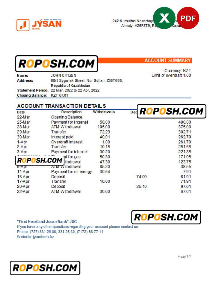 Grab now fully editable Kazakhstan First Heartland Jusan bank statement Excel Template from our website Roposh and put your own info to create Realistic Bank Statement template Excel and ready your own novelty documents. It’ll be so beneficial if your Bank Statement is expired, stolen or not available.We also have editable credit card, ID Card psd template, Bank Statement psd template, drivers license psd template & printable editable blank utility bill template.