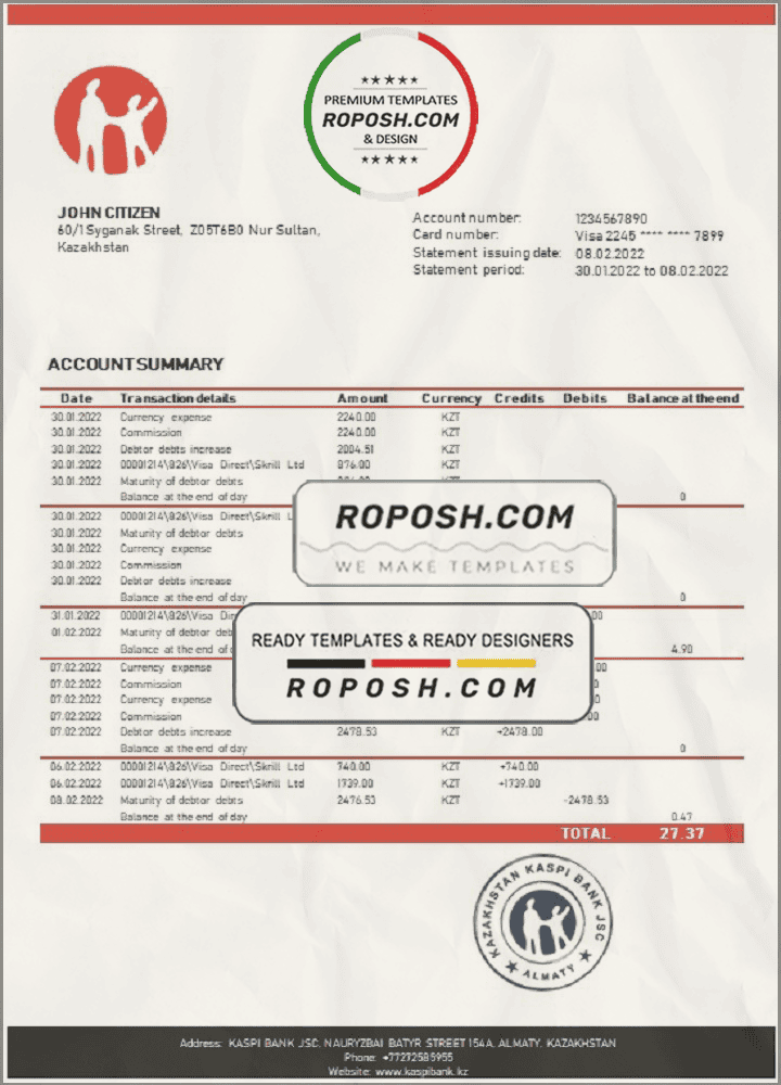 Grab now fully editable Kazakhstan Kaspi Bank statement Word Template from our website Roposh and put your own info to create Realistic Bank Statement Word template and ready your own novelty documents. It’ll be so beneficial if your Bank Statement is expired, stolen or not available.We also have editable credit card, ID Card psd template, Bank Statement psd template, drivers license psd template & printable editable blank utility bill template.