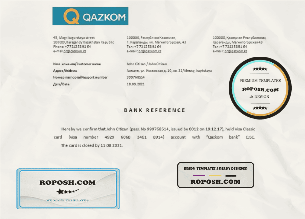 Kazakhstan Qazkom bank account closure reference letter template in Word and PDF format