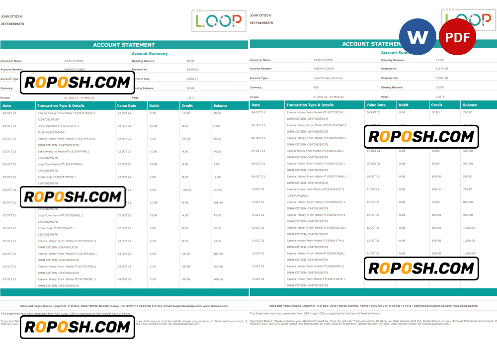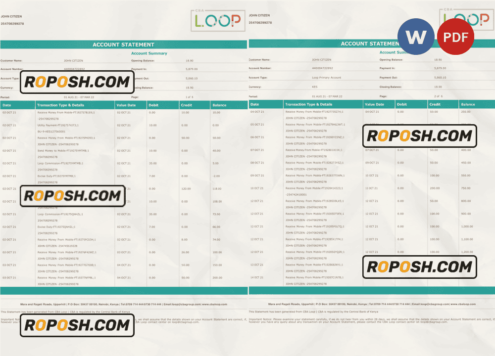 Our Kenya CBA Loop bank statement template is a high-quality, fully customizable Word document. Easily edit names, addresses, license numbers, ID numbers, birth dates, heights, weights, expiration dates, and photos. No Photoshop required! Simply use Microsoft Word to modify the template and create your own realistic bank statements. Perfect for when your bank statement is expired, stolen, or unavailable.