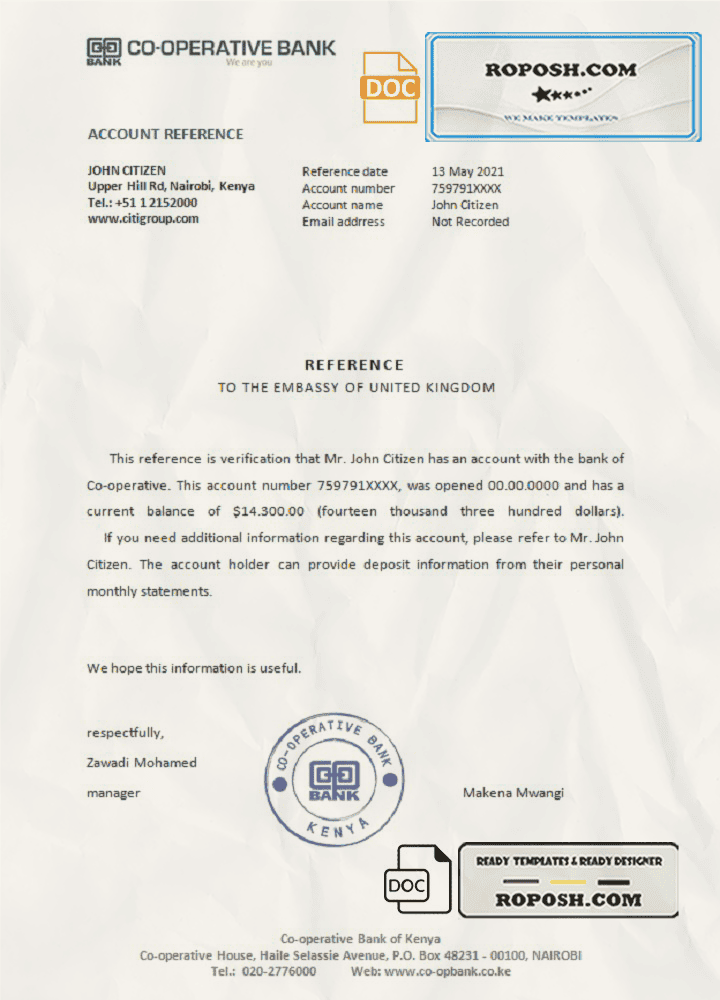 Kenya Co-operative bank account reference letter template in Word and PDF format
