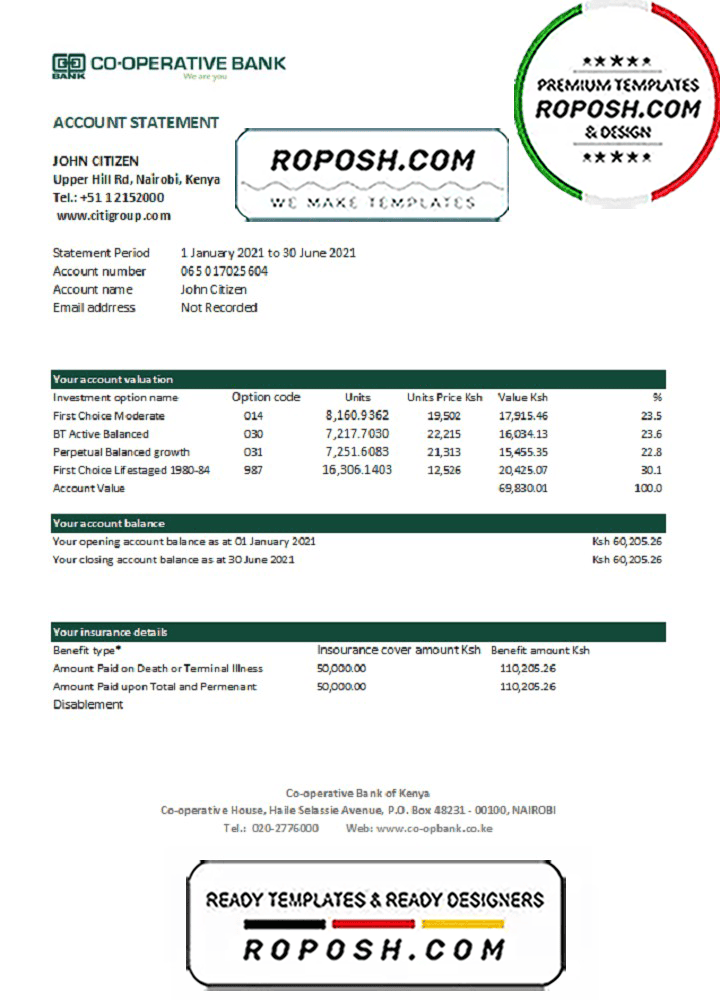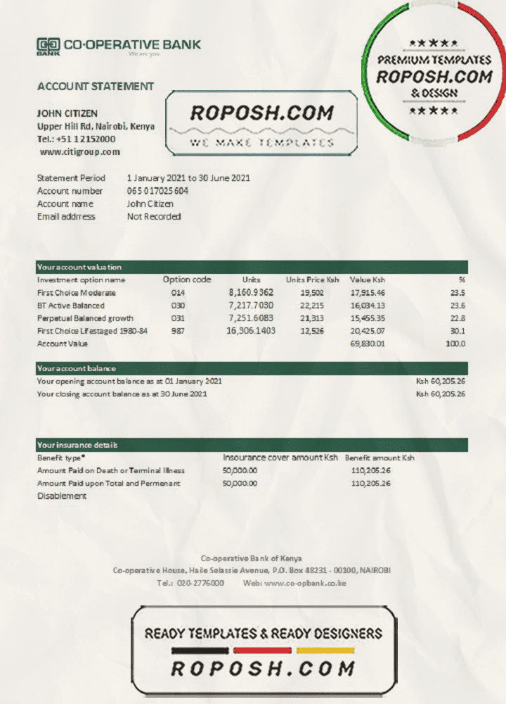 Get your fully editable Kenya Co-operative Bank Statement Template from Roposh. Customize it with your information to create a realistic bank statement. Perfect for when your bank statement is expired, stolen, or unavailable. We also offer editable credit card templates, ID card templates, bank statement PSD templates, driver’s license templates, and printable editable blank utility bill templates.