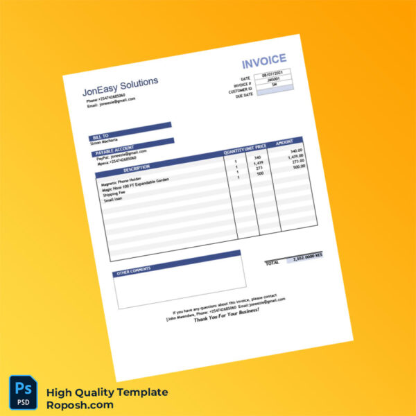 High-fidelity templates play a critical role in design portfolios, educational projects, and mock-ups, especially within professional and print industries. Achieving a pixel-perfect invoice layout that adheres strictly to design standards is often challenging due to inconsistent font use, blurred edges, or incompatible file formats. The Kenya JonEasy Solutions Invoice Template is crafted to solve these pain points by delivering a meticulously designed, clean, and accurate document ideal for professional invoicing. Such templates not only enhance presentation but also streamline workflows across diverse businesses and freelancers in need of certified print-ready assets tailored to Kenya’s commercial context.