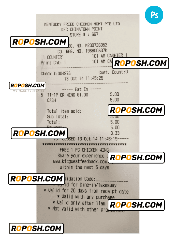 A KFC payment receipt in psd format is a document that can prove a successful transaction. It includes the purchase details such as the date of the transaction, the amount paid, a description of goods or services purchased, and a unique receipt number.