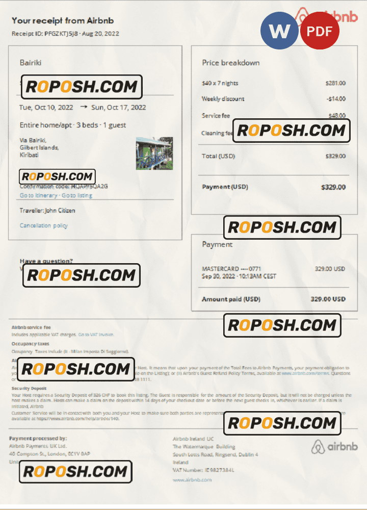 This Blank Kiribati Airbnb booking confirmation PDF Template is perfect for a variety of uses, such as Visa applications, proof of accommodation, showing your expenses, and more. You can even use it to create realistic copies of your credit card for novelty documents. We have a variety of other templates available, including passport templates, ID card templates, reciept template, and more.