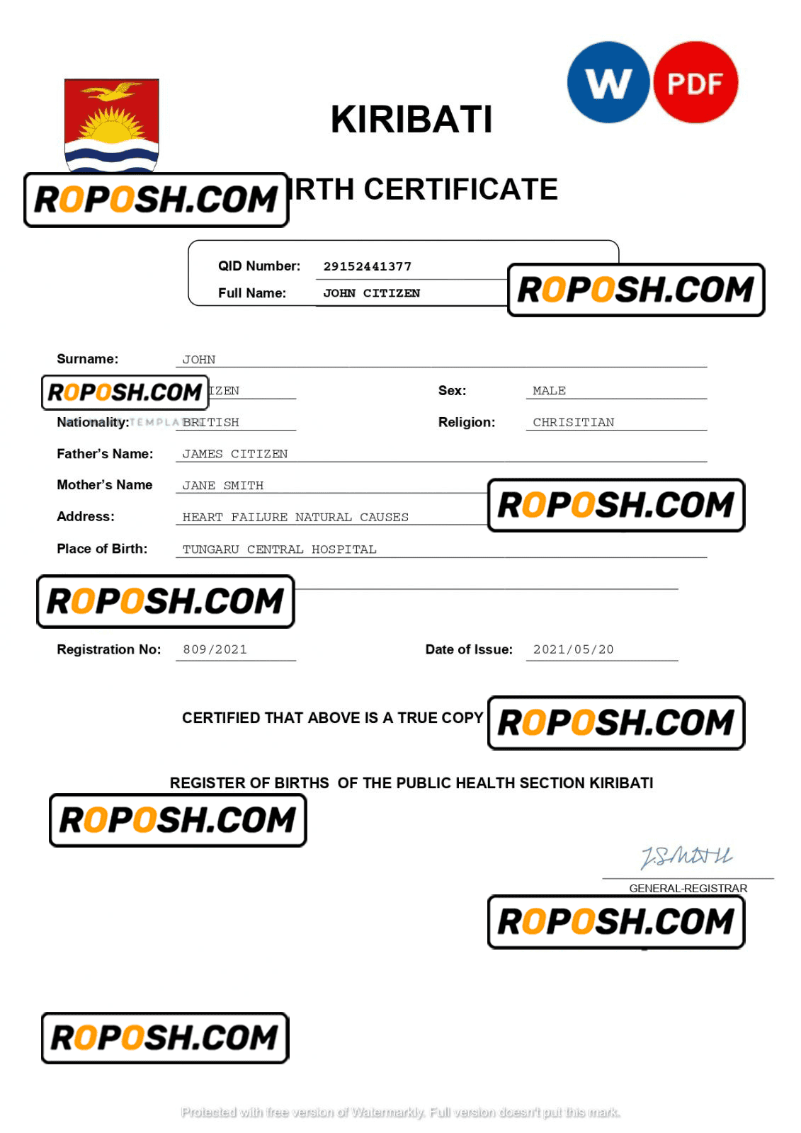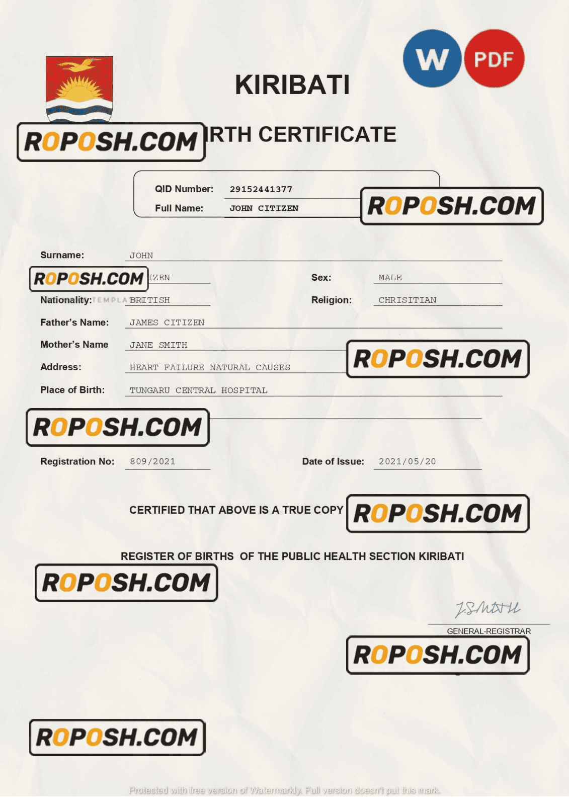 roposh offers hundreds of high-quality, realistic, and customizable birth certificates. The Kiribati birth certificate template is fully fillable, and you can complete it with any information you wish, such as name, surname, birth date, place of birth and etc. Whether you are using our PSD template (a layer-based adobe photoshop file) or our PDF template (a Microsoft Office editable file) you will get a package with fonts included instantly. No need to worry even if you can’t generate realistic birth proof yourself, we offer reliable editing service with your desired information for an extra charge. Also, we are always online and here to help you experience a confident purchase. So, reach out!