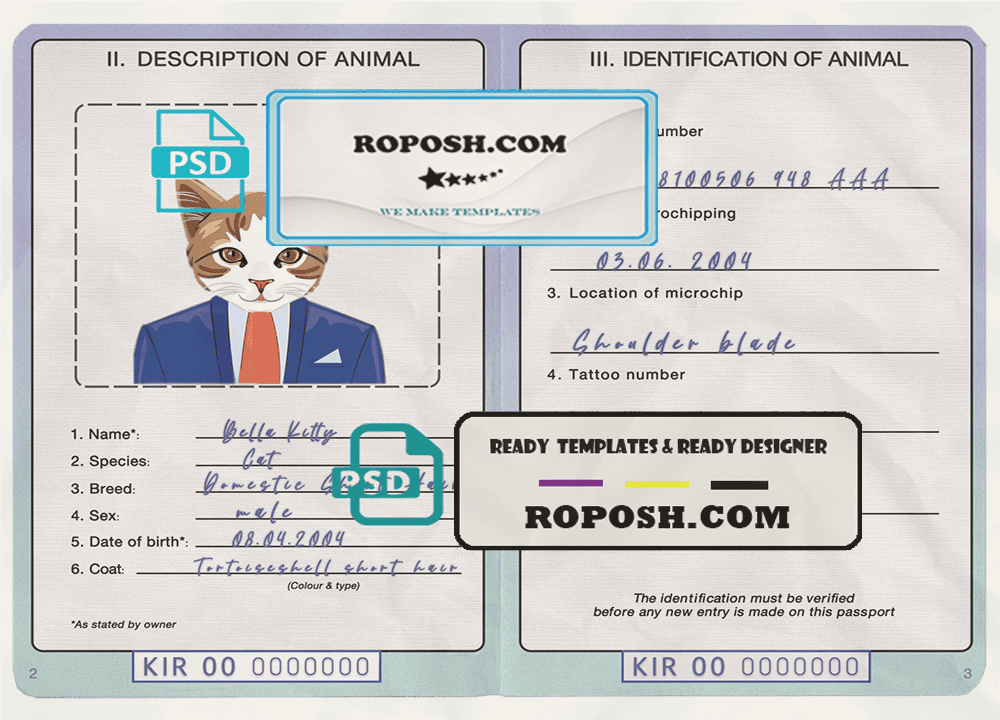 Kiribati cat (animal, pet) passport PSD template, is your one-stop-shop for realistic and editable editable pet identity cards and passports. We specialize in creating high-quality, customizable editable pet passports and identity cards for dogs, cats, and other furry friends.