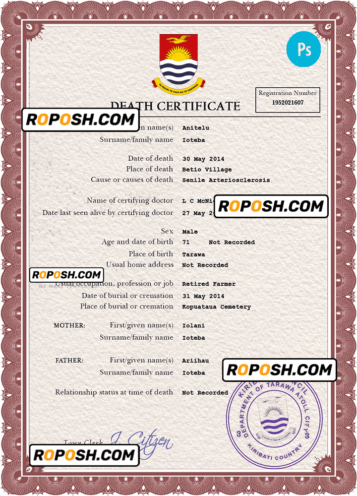 Explore a vast collection of legitimate-looking editable death certificates for several countries worldwide. The editable Kiribati death certificates offers easy access to obtaining the required document for a variety of purposes, predominantly claiming life insurance, pensions, and resolving estates.
