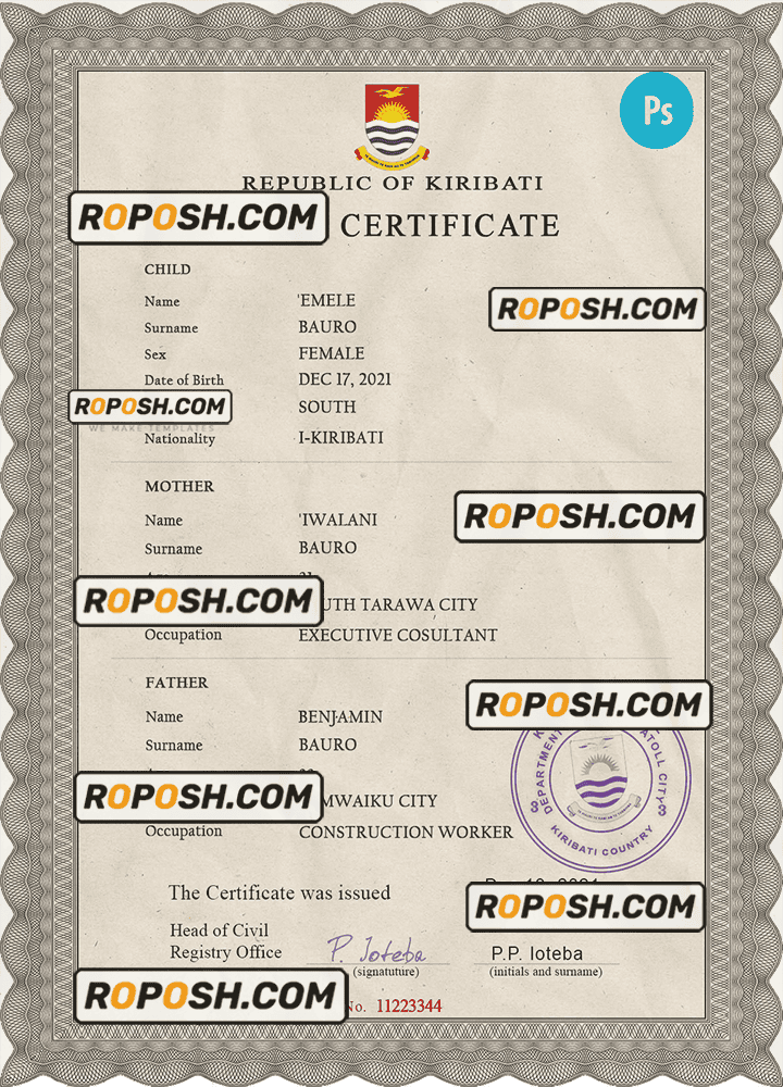roposh offers hundreds of high-quality, realistic, and customizable birth certificates. The Kiribati birth certificate template is fully fillable, and you can complete it with any information you wish, such as name, surname, birth date, place of birth and etc. Whether you are using our PSD template (a layer-based adobe photoshop file) or our PDF template (a Microsoft Office editable file) you will get a package with fonts included instantly. No need to worry even if you can’t generate realistic birth proof yourself, we offer reliable editing service with your desired information for an extra charge. Also, we are always online and here to help you experience a confident purchase. So, reach out!