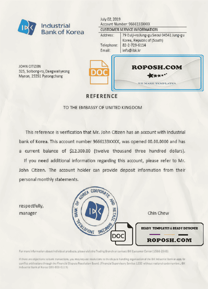 Korea Industrial Bank of Korea bank account reference letter template in Word and PDF format
