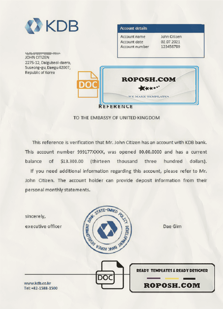 Korea KDB bank account reference letter template in Word and PDF format