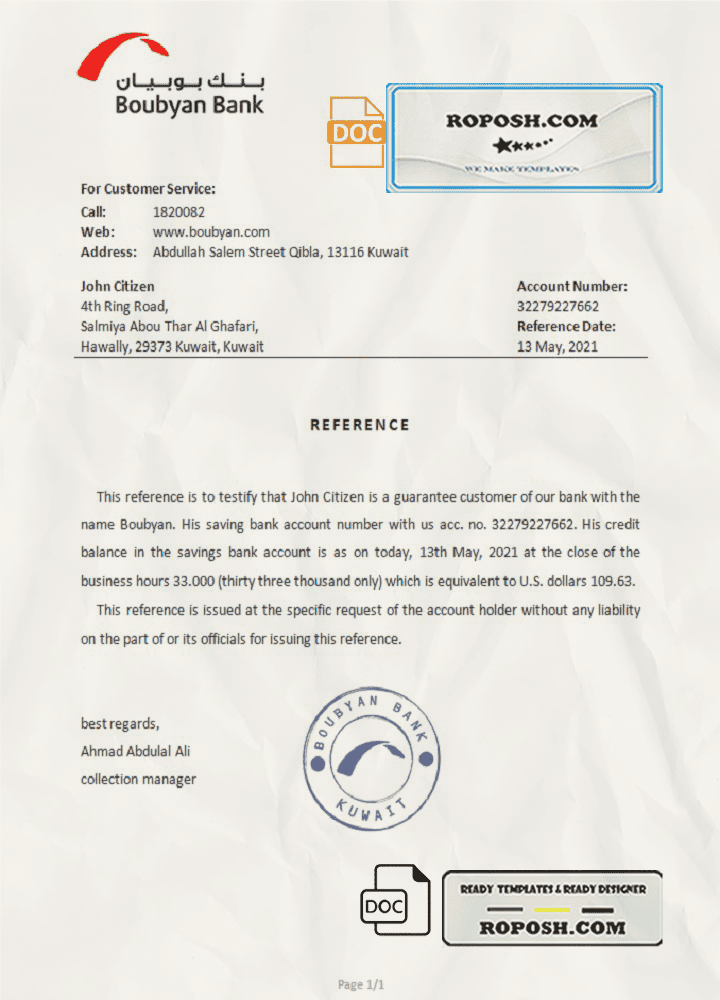 Kuwait Boubyan bank account reference letter template in Word and PDF format