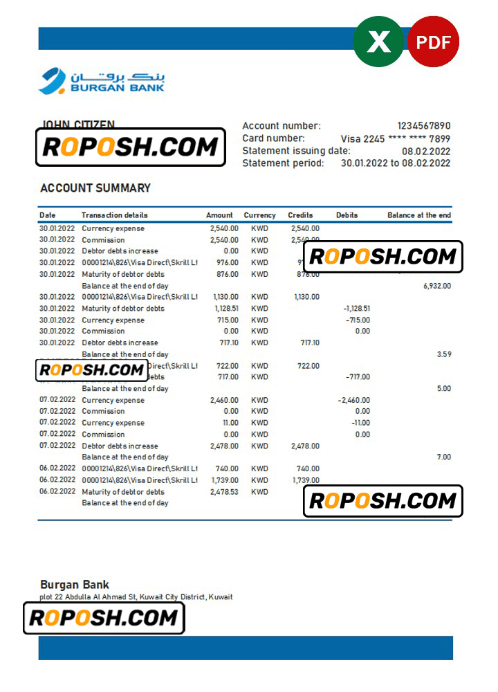 Grab now fully editable Kuwait Burgan bank statement Excel Template from our website Roposh and put your own info to create Realistic Bank Statement template Excel and ready your own novelty documents. It’ll be so beneficial if your Bank Statement is expired, stolen or not available.We also have editable credit card, ID Card psd template, Bank Statement psd template, drivers license psd template & printable editable blank utility bill template.