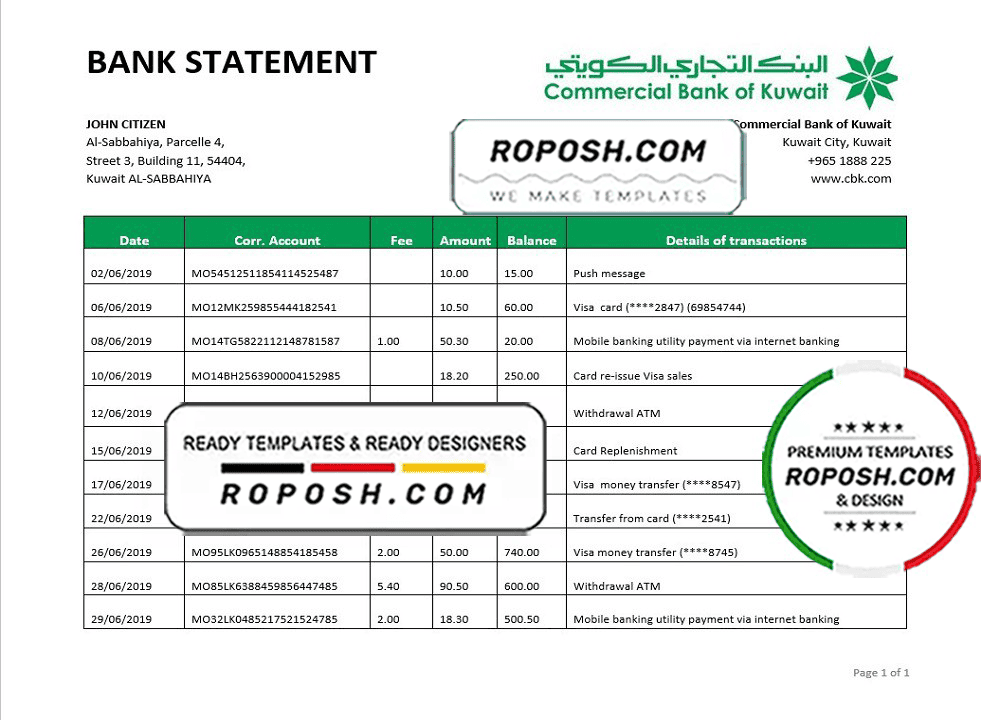 Get your fully editable Kuwait Commercial Bank statement template from Roposh today. Customize it with your own information to create a realistic bank statement for educational or theatrical purposes. This template is perfect if your bank statement is expired, stolen, or unavailable. We also offer editable credit card templates, ID card templates, bank statement PSD templates, driver’s license PSD templates, and printable editable blank utility bill templates.