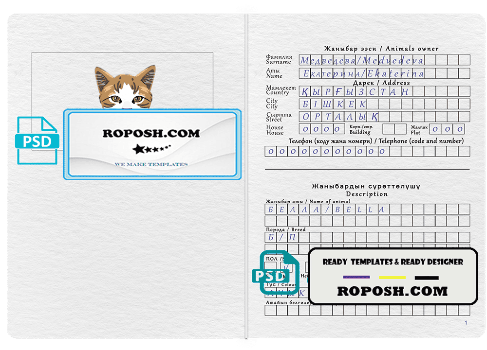Kyrgyzstan cat (animal, pet) passport PSD template, is your one-stop-shop for realistic and editable editable pet identity cards and passports. We specialize in creating high-quality, customizable editable pet passports and identity cards for dogs, cats, and other furry friends.