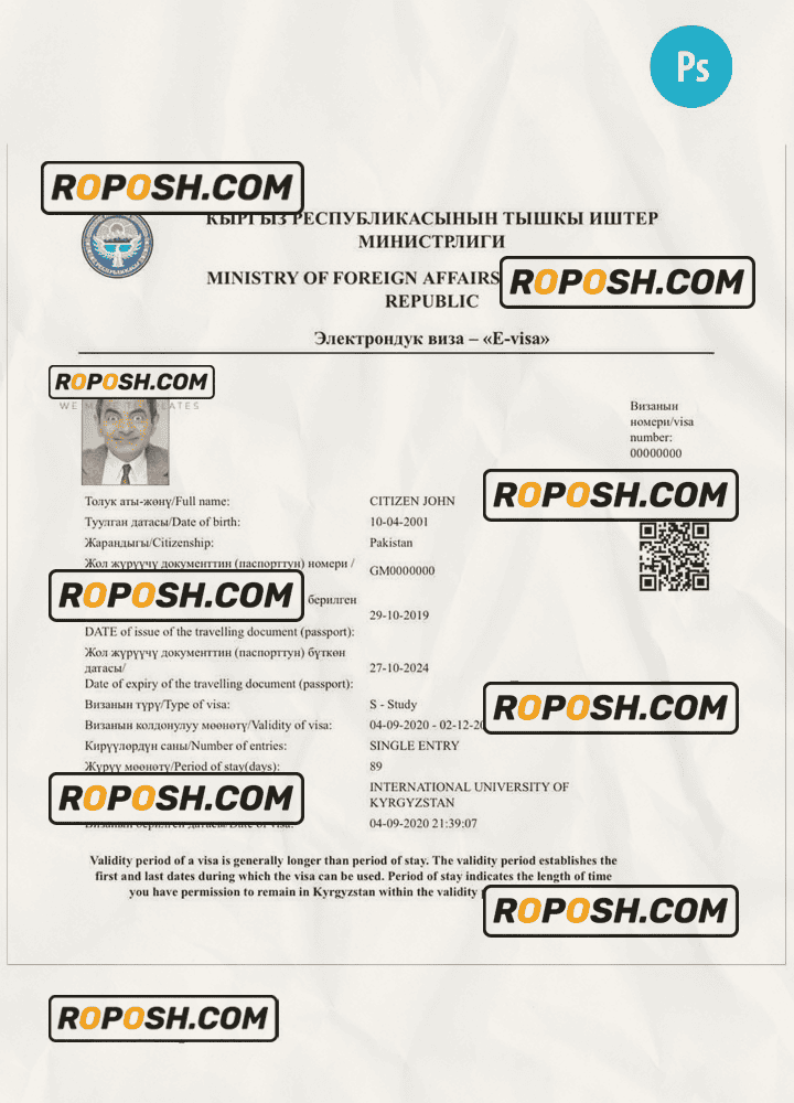 KYRGYZSTAN electronic visa template psd. Buy Customizable Travel Visa Template with high quality and enjoy its unique features such as easy to customize, Layer based, fonts included sample. you can edit this template and put any name, address, license number, Id number, birth date, height, weight, expire date, change photos etc. This Photoshop template is a layer based psd file and it’s easy to Editing.To modify this photoshop template file you will need a Photo editing software such as Adobe Photoshop No need to be expert on editing software like adobe Photoshop. However, You just have to basic knowledge on adobe photoshop, to edit this template. Never used low quality template. Your account may be suspended. Also, if you’re looking for an editable SSN template, Roposh is by your side so you can get it easily and even for free.
