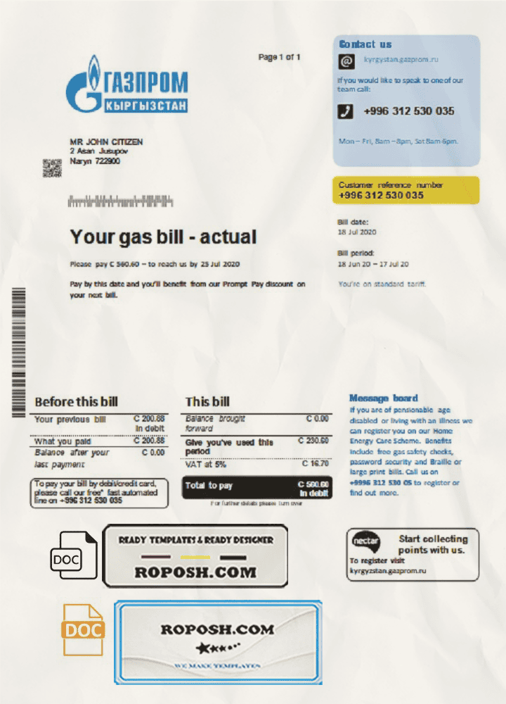 Get your blank Kyrgyzstan Gazprom utility bill template from Roposh today. Customize it with your own information to create a realistic editable utility bill for proof of address. Ideal for situations where your utility bill is expired, stolen, or unavailable. We also offer a variety of other templates, including passport PSD templates, ID card PSD templates, bank statement PSD templates, driver’s license PSD templates, and more.