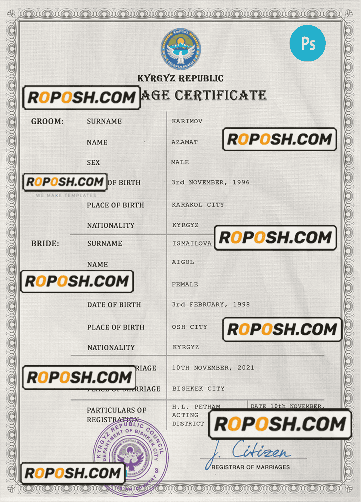 Kyrgyzstan marriage certificate PSD template, fully editable
