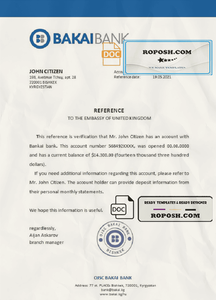 Kyrgyzstan OJSC Bakai Bank bank account reference letter template in Word and PDF format
