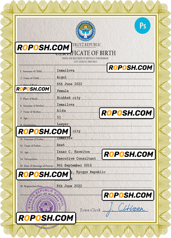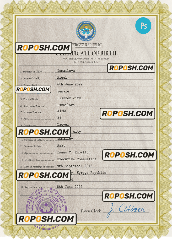 roposh offers hundreds of high-quality, realistic, and customizable birth certificates. The Kyrgyzstan birth certificate template is fully fillable, and you can complete it with any information you wish, such as name, surname, birth date, place of birth and etc. Whether you are using our PSD template (a layer-based adobe photoshop file) or our PDF template (a Microsoft Office editable file) you will get a package with fonts included instantly. No need to worry even if you can’t generate realistic birth proof yourself, we offer reliable editing service with your desired information for an extra charge. Also, we are always online and here to help you experience a confident purchase. So, reach out!