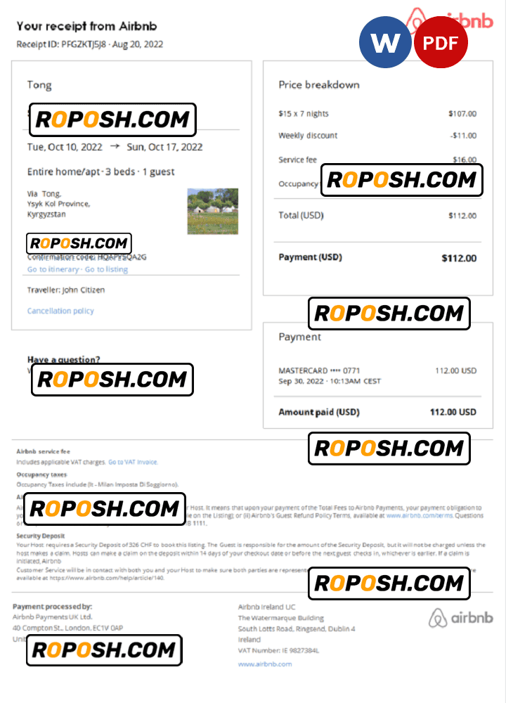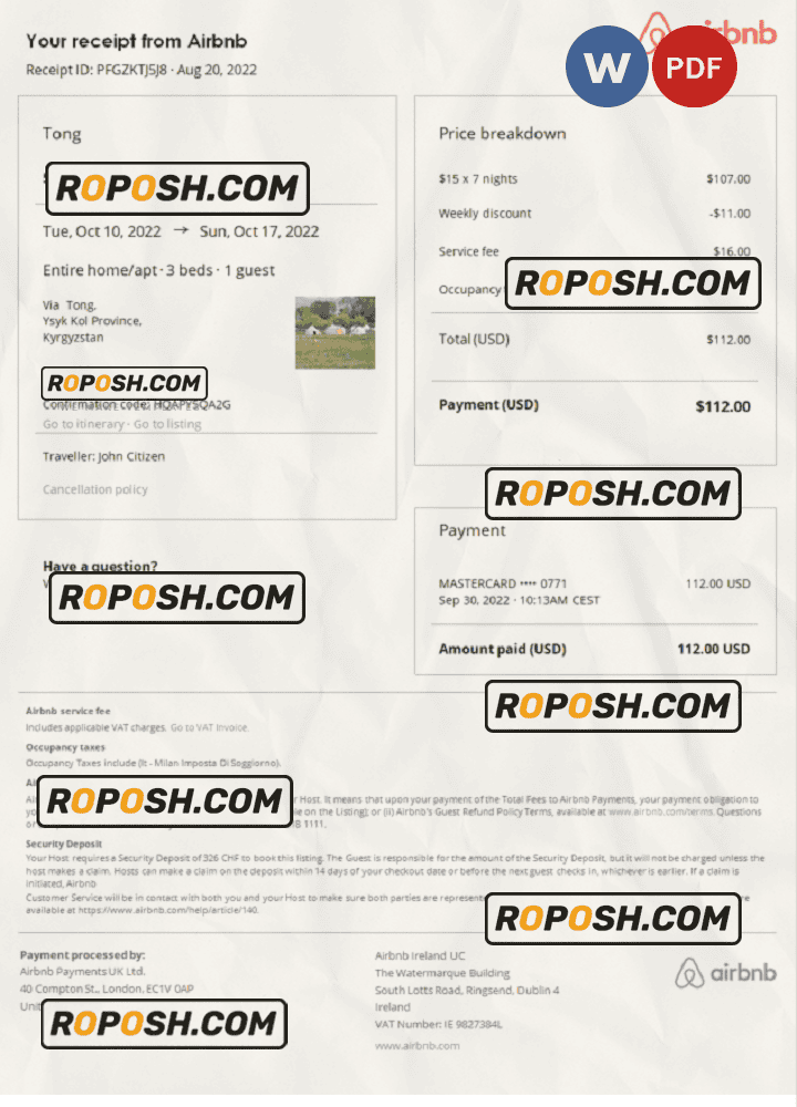 This Blank Kyrgyztsan Airbnb booking confirmation PDF Template is perfect for a variety of uses, such as Visa applications, proof of accommodation, showing your expenses, and more. You can even use it to create realistic copies of your credit card for novelty documents. We have a variety of other templates available, including passport templates, ID card templates, reciept template, and more.