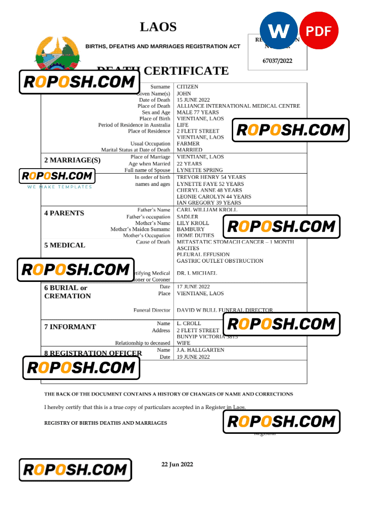 Explore a vast collection of legitimate-looking editable death certificates for several countries worldwide. The editable Laos death certificates offers easy access to obtaining the required document for a variety of purposes, predominantly claiming life insurance, pensions, and resolving estates.