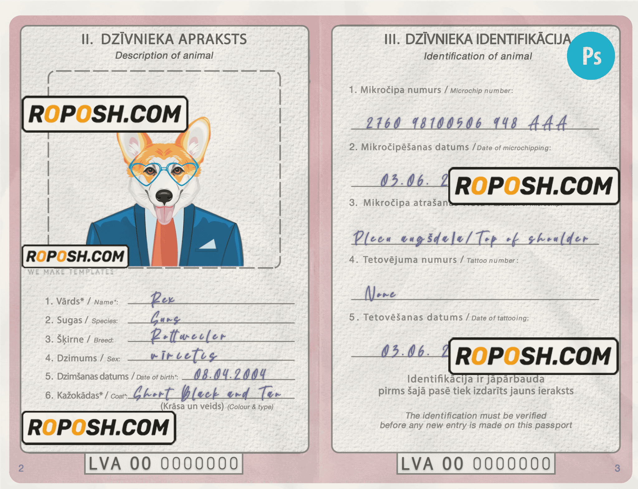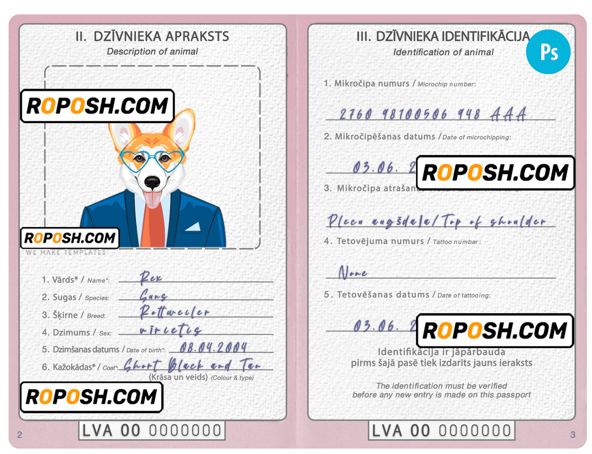 Latvia dog (animal, pet) passport PSD template, is your one-stop-shop for realistic and editable editable pet identity cards and passports. We specialize in creating high-quality, customizable editable pet passports and identity cards for dogs, cats, and other furry friends.