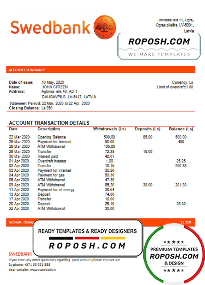 Grab now fully editable Latvia Swedbank bank statement Word Template from our website Roposh and put your own info to create Realistic Bank Statement Word template and ready your own novelty documents. It’ll be so beneficial if your Bank Statement is expired, stolen or not available.We also have editable credit card, ID Card psd template, Bank Statement psd template, drivers license psd template & printable editable blank utility bill template.