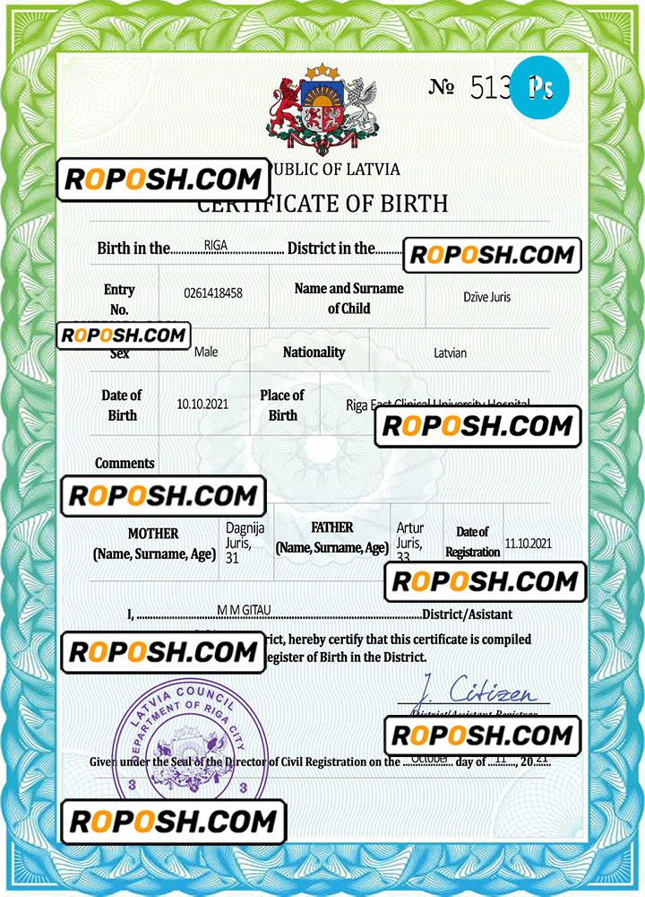 roposh offers hundreds of high-quality, realistic, and customizable birth certificates. The Latvia birth certificate template is fully fillable, and you can complete it with any information you wish, such as name, surname, birth date, place of birth and etc. Whether you are using our PSD template (a layer-based adobe photoshop file) or our PDF template (a Microsoft Office editable file) you will get a package with fonts included instantly. No need to worry even if you can’t generate realistic birth proof yourself, we offer reliable editing service with your desired information for an extra charge. Also, we are always online and here to help you experience a confident purchase. So, reach out!