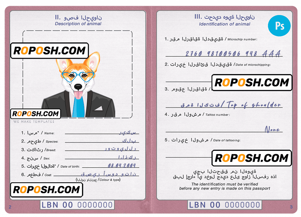 Lebanon dog (animal, pet) passport PSD template, is your one-stop-shop for realistic and editable editable pet identity cards and passports. We specialize in creating high-quality, customizable editable pet passports and identity cards for dogs, cats, and other furry friends.