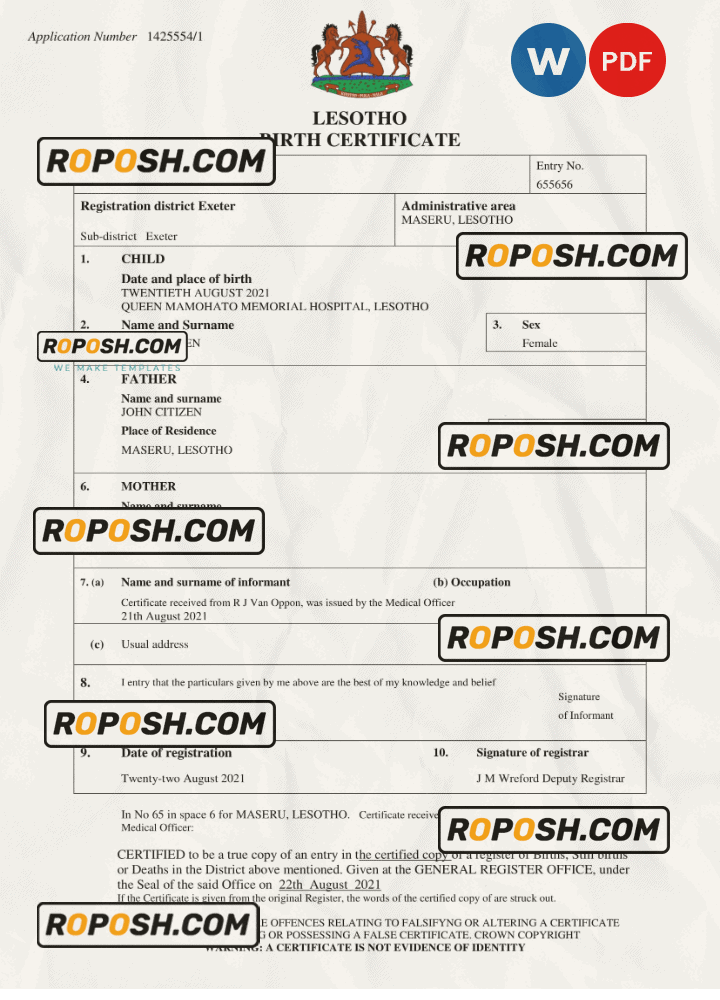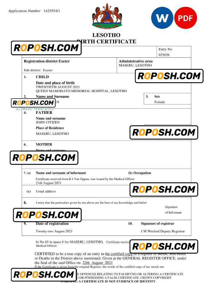 roposh offers hundreds of high-quality, realistic, and customizable birth certificates. The Lesotho birth certificate template is fully fillable, and you can complete it with any information you wish, such as name, surname, birth date, place of birth and etc. Whether you are using our PSD template (a layer-based adobe photoshop file) or our PDF template (a Microsoft Office editable file) you will get a package with fonts included instantly. No need to worry even if you can’t generate realistic birth proof yourself, we offer reliable editing service with your desired information for an extra charge. Also, we are always online and here to help you experience a confident purchase. So, reach out!
