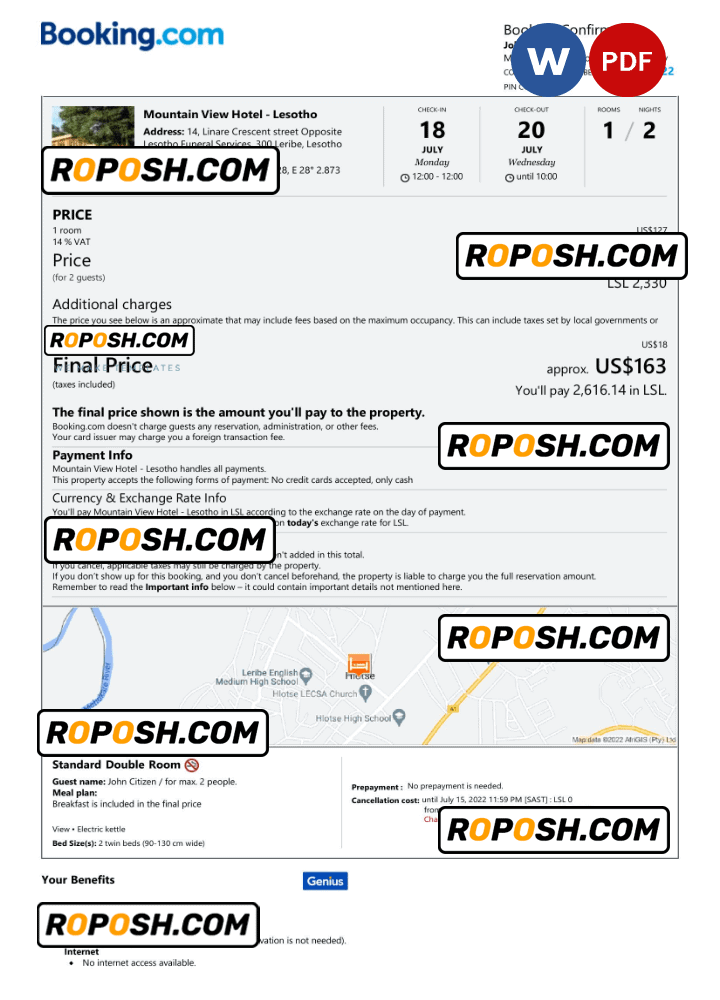 With its user-friendly design and flexible editing capabilities, this editable Lesotho hotel booking confirmation hotel, room, house, and Airbnb reservation proof is the perfect choice for anyone looking to create a professional-quality editable hotel accommodation reception. So why wait?